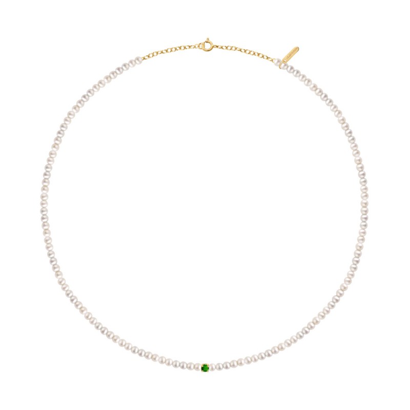 Vous vous émerveillez devant les ors de Buckingham et rêvez de faire votre entrée dans le monde, le collier Fresh princess est fait pour vous. Ce collier de 40 cm (contre-anneau à 38 cm) en or jaune 18 carats est composé d’environ 110 perles de cultures blanches (∅ 3/ 3,5 mm) et d’une émeraude 3 mm serti sur chaton 4 griffes en or jaune 18 carats.
