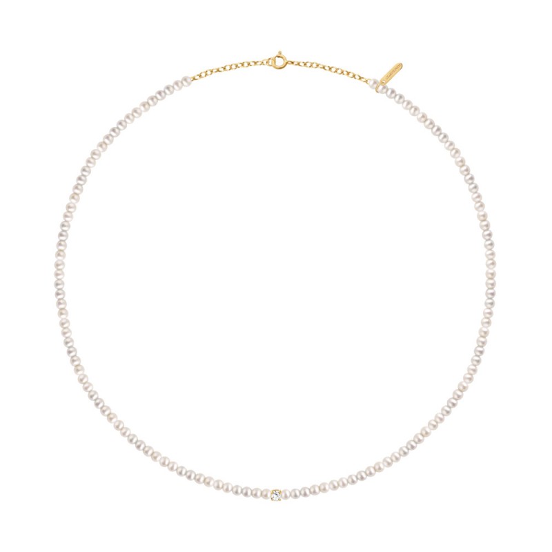 Vous vous émerveillez devant les ors de Buckingham et rêvez de faire votre entrée dans le monde, le collier Fresh princess est fait pour vous. Ce collier de 40 cm (contre-anneau à 38 cm) en or jaune 18 carats est composé d’environ 110 perles de cultures blanches (∅ 3/ 3,5 mm) et d’un diamant 3 mm serti sur chaton 4 griffes en or jaune 18 carats.