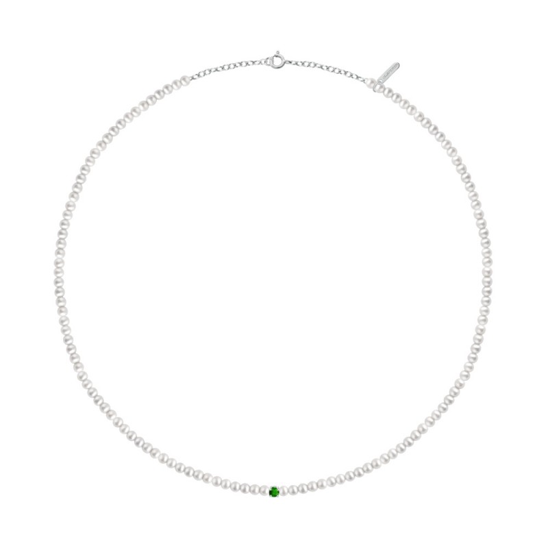 Vous vous émerveillez devant les ors de Buckingham et rêvez de faire votre entrée dans le monde, le collier Fresh princess est fait pour vous. Ce collier de 40 cm (contre-anneau à 38 cm) en or blanc 18 carats est composé d’environ 110 perles de cultures blanches (∅ 3/ 3,5 mm) et d’une émeraude 3 mm serti sur chaton 4 griffes en or blanc 18 carats.