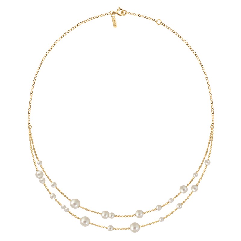 Collier Parade, 22 perles blanches de 5 tailles différentes (de 3 à 7 mm) réparties harmonieusement sur une double chaine en or jaune 18 carats d'une longueur de 45 cm (contre-anneau à 42 cm).
