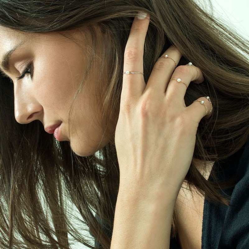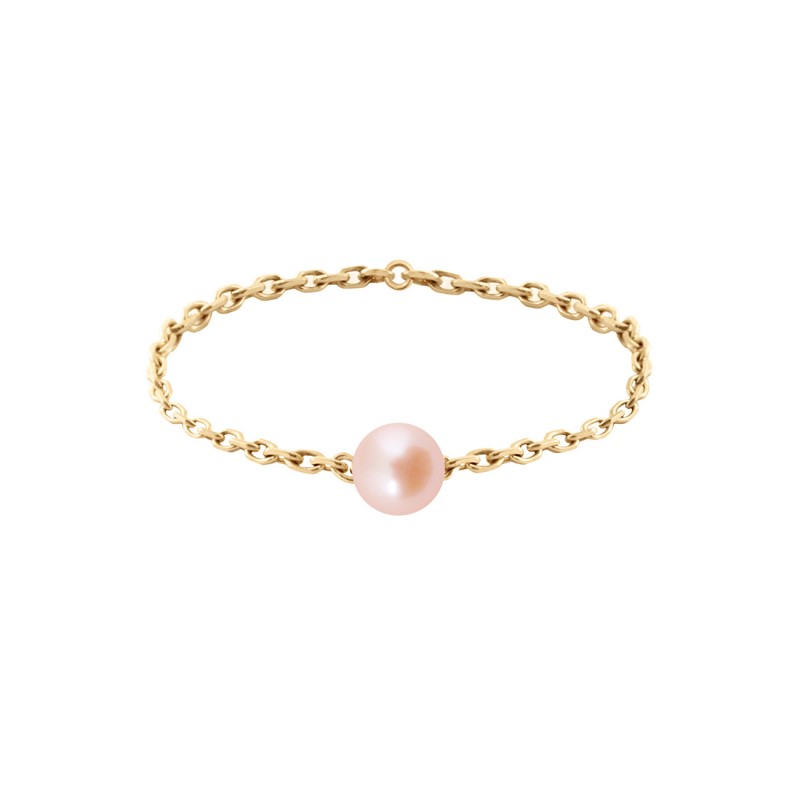 Bague perle rose (3.5/4 mm) sur chaîne en or jaune 18 carats.