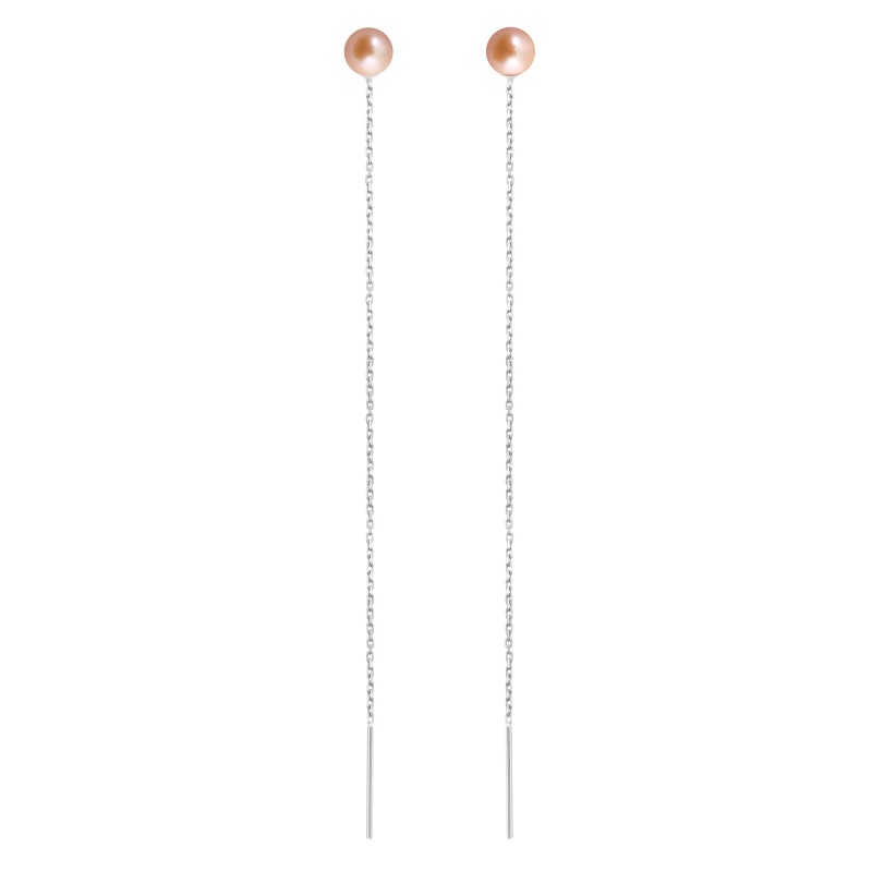 Boucles d'oreille en or blanc 18 carats, chaîne forçat fine et perle rose 4,5/5 mm.