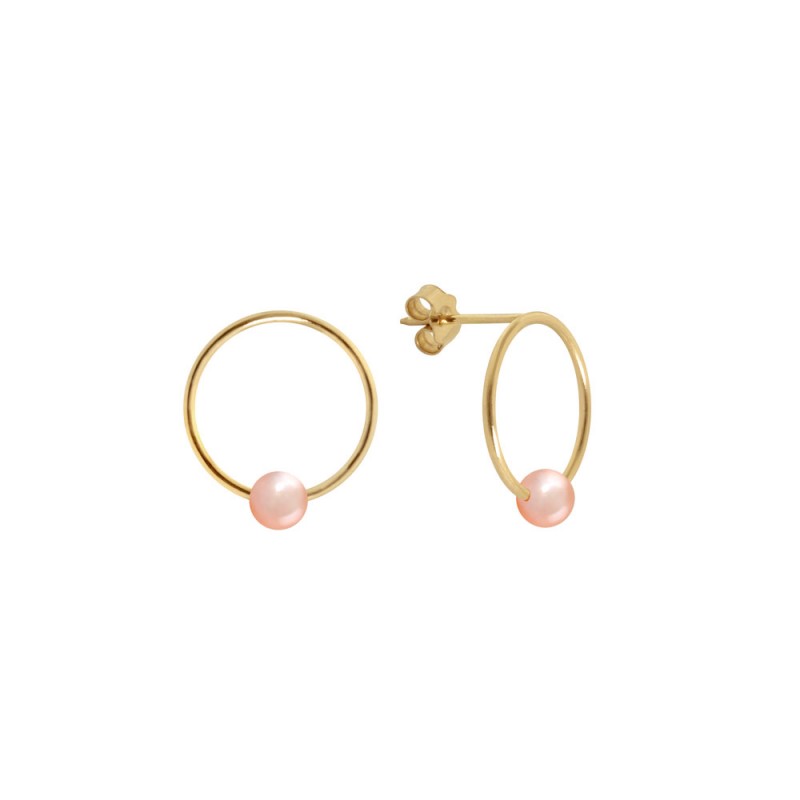 Boucles d'oreilles cercle en fil d'or jaune 18 carats de 0,9 mm d'épaisseur, diamètre 13 mm avec une perle rose de 3,5/4 mm.