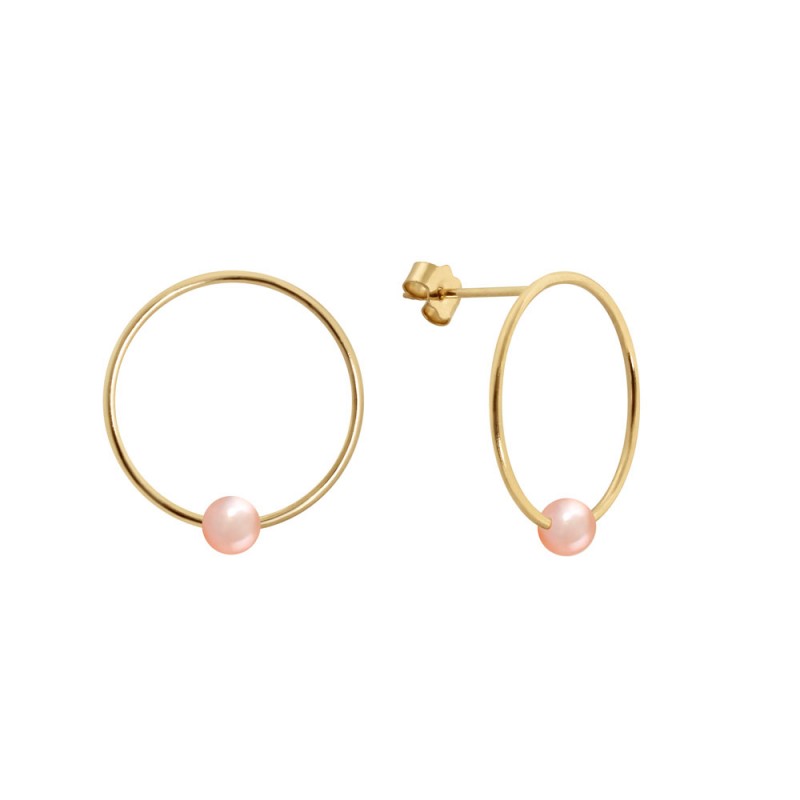 Boucles d'oreilles cercle en fil d'or jaune 18 carats de 0,9 mm d'épaisseur, diamètre 16 mm avec une perle rose de 3,5/4 mm.