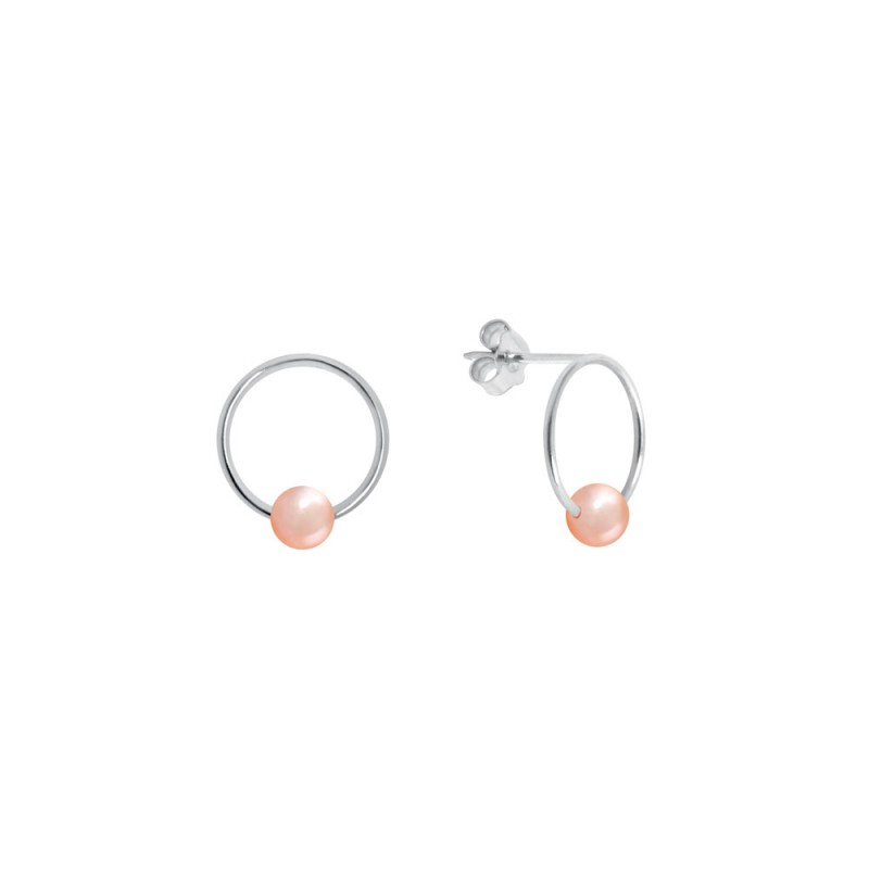 Boucles d'oreilles cercle en fil d'or blanc 18 carats de 0,9 mm d'épaisseur, diamètre 10 mm avec une perle rose de 3,5/4 mm.