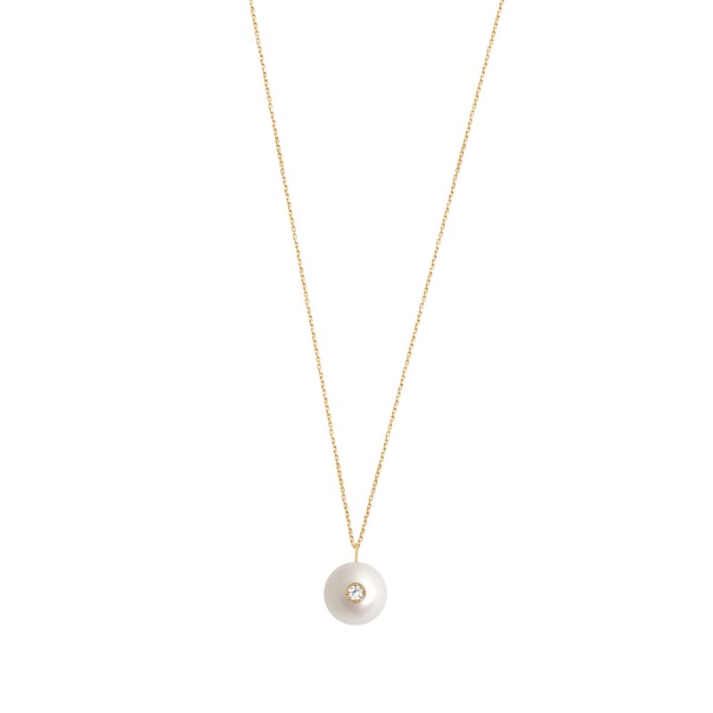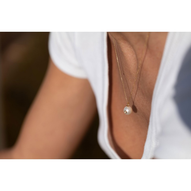 Collier 45 cm (contre-anneau à 42 cm) en or jaune 18 carats. Une perle de culture blanche (∅ 9 mm), dans laquelle un diamant de 1,6 mm a été serti, est fixée sur une bélière à la chaîne. La perle est en mouvement sur la chaîne.